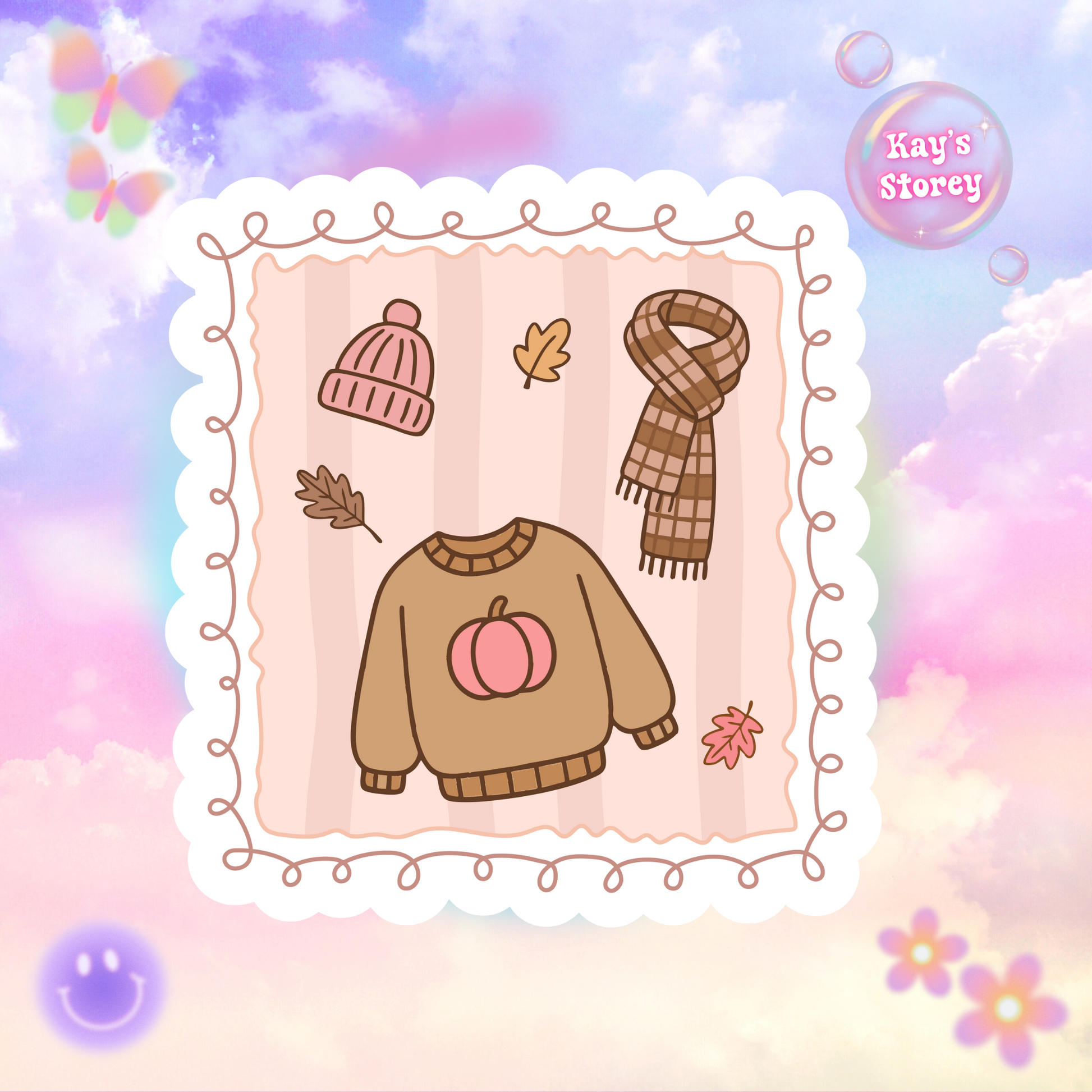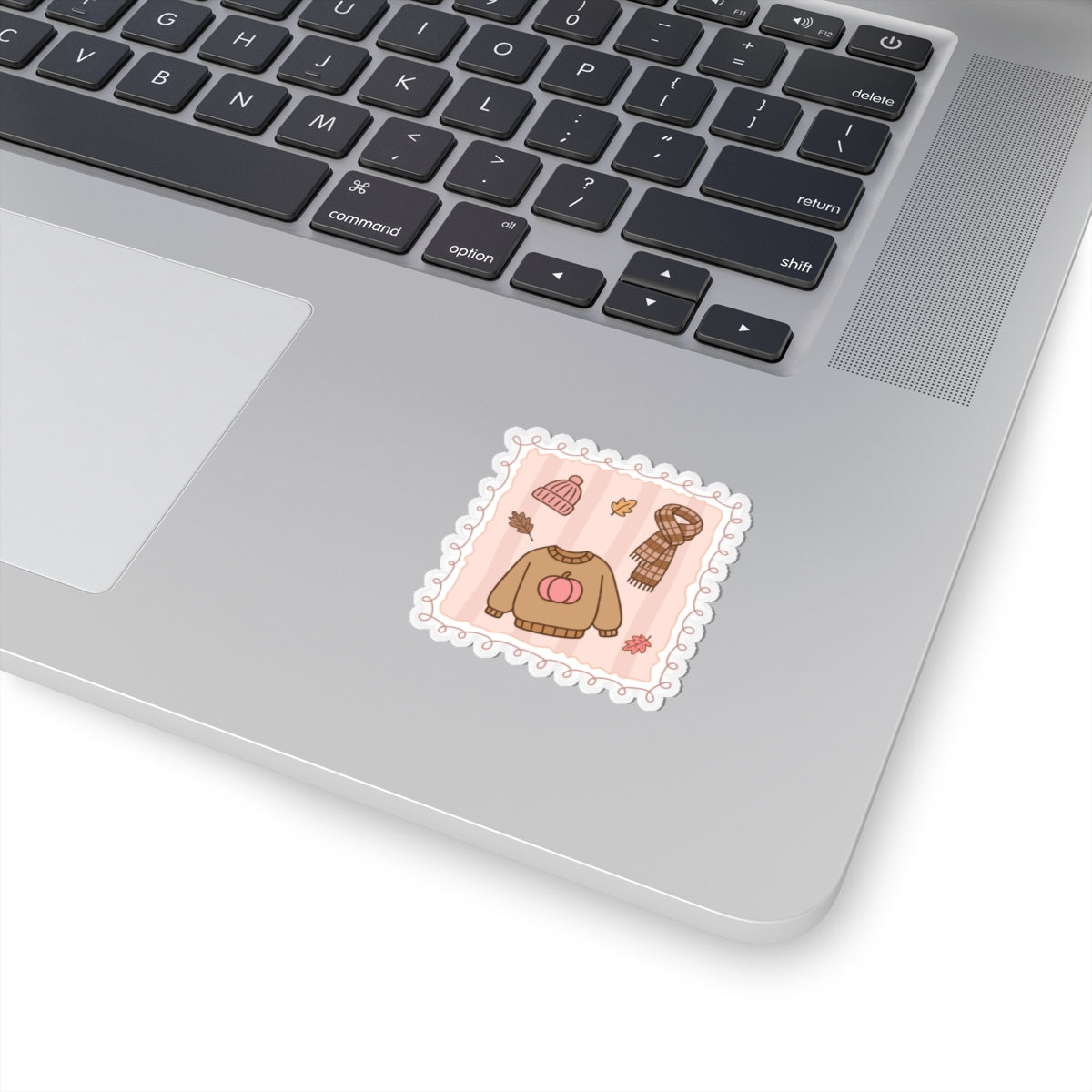Add a cozy autumn vibe to your laptop or journal with this kiss-cut sticker featuring Autumn fashion accessories. Perfect for book lovers and those who enjoy the fall season. Ideal for decorating for Halloween or Thanksgiving.